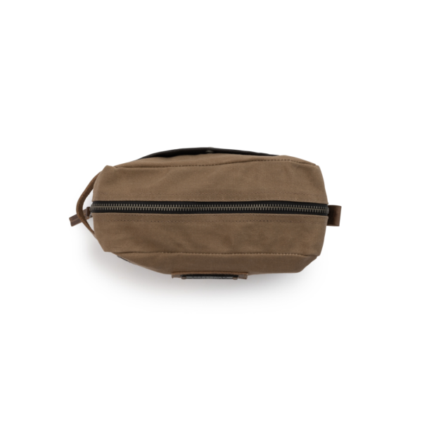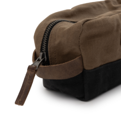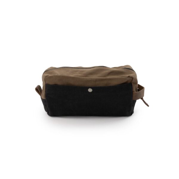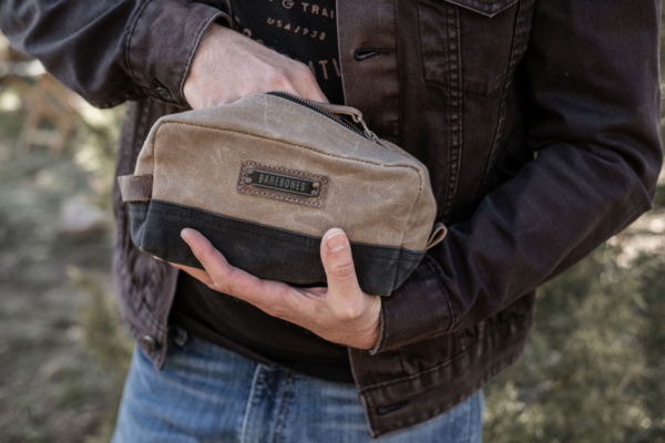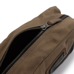 The Barebones Neelum Dopp Kit toiletry bag is an ideal toiletry bag for travel as you can easily access your grooming supplies. The toiletry bag has a durable design is water repellent. The toiletry bag contains waxed canvas that is pliable, allowing it to hold up to 1.7 ounces. Converted, this means it can hold about 8 travel bottles. The sturdy zipper keeps products from sliding around in the toiletry bag. Due to the waxed canvas, the toiletry bag is of a strong quality. During use, the toiletry bag is easy to clean and wipe down. On the back is another small pocket with a snap button where any flat things can be stored.