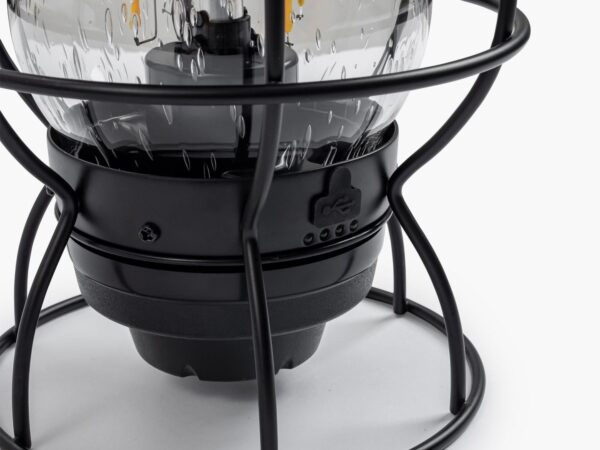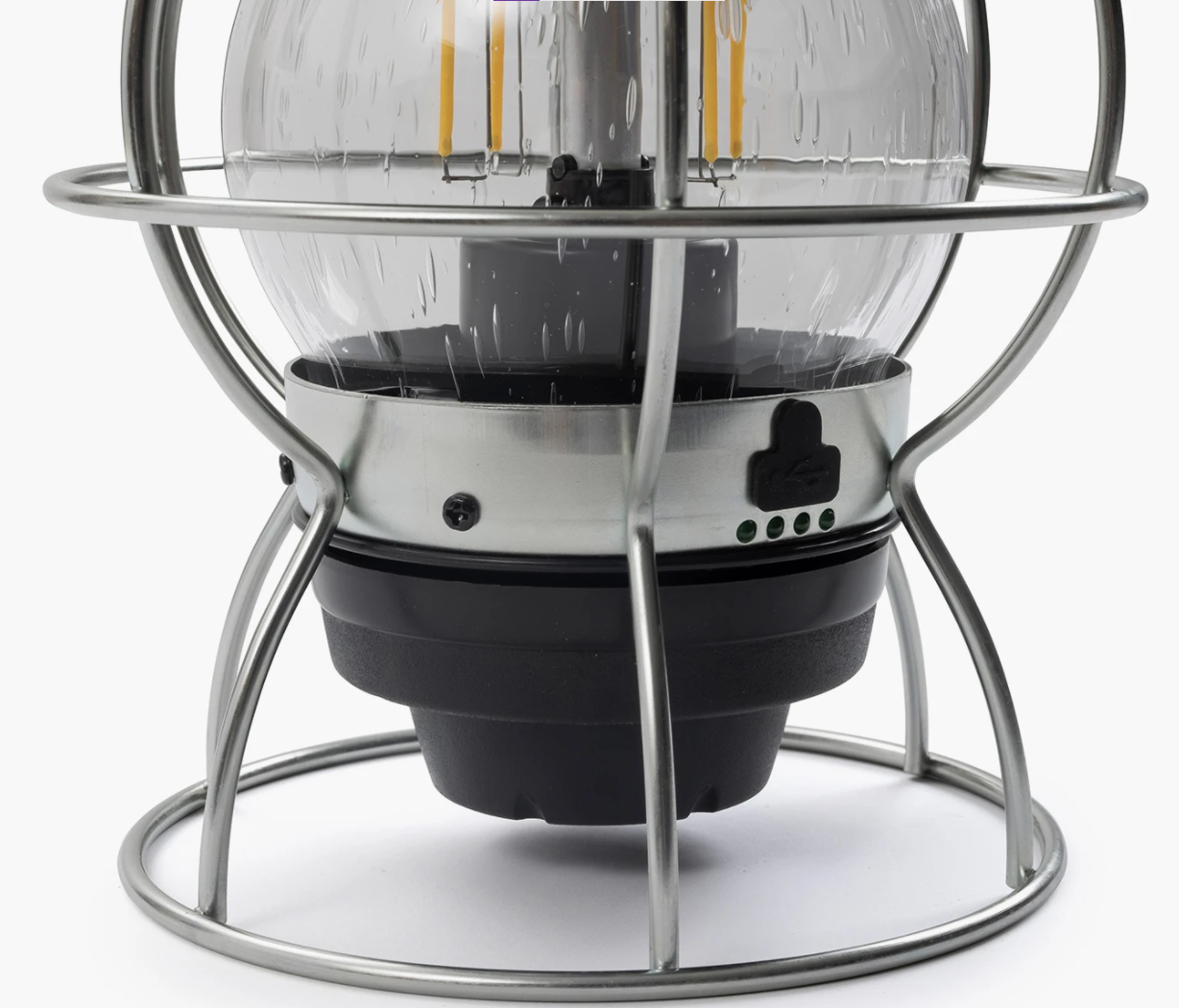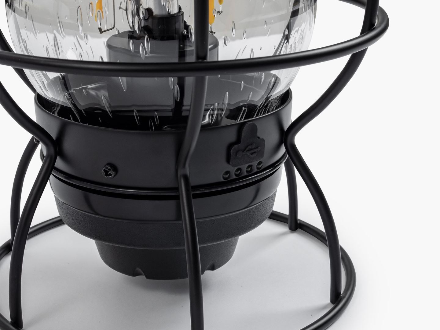 The Railroad Lantern has a warm light that is adjustable in brightness. At maximum brightness the lamp has a burn time of 3.5 hours, for low brightness this increases to approx. 100 hours. The lamp is powered by battery or USB cable. Furthermore, the lamp is infinitely dimmable.