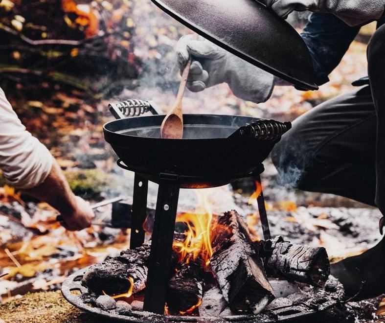The grill can be packed into a stand-alone bundle. The collapsible legs have holes in the base for secure and stable attachment with pegs. In addition, the tripod with ring is also suitable for a Skillet pan 10 inches or a Skillet pan 12 inches. The wok is suitable for induction.